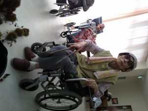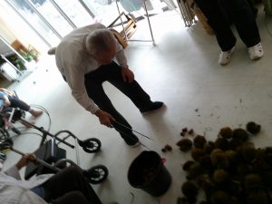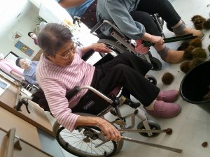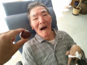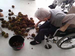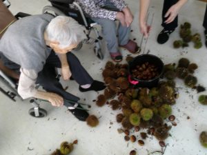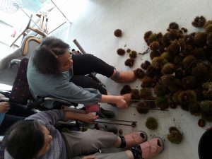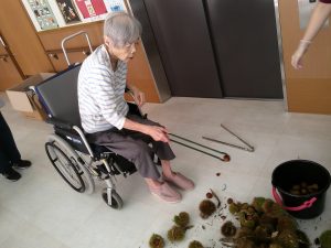 今度は施設に栗を持ちかえり、栗拾いに行けなかった方も一緒に栗拾いです(^^)/