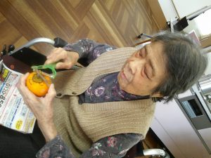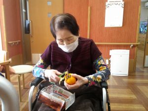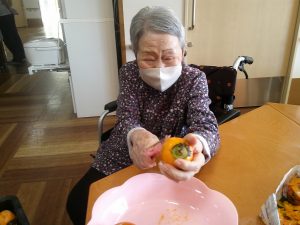 職員が持ってきた柿で干し柿作りをしました(^^)/